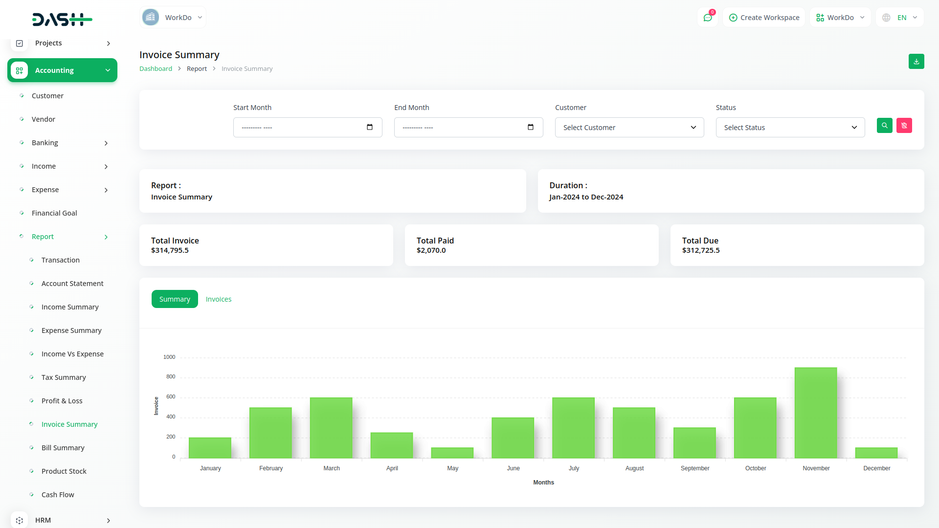 Nhận báo cáo về các giao dịch với tùy chọn lọc dễ dàng. Tải xuống các báo cáo tài khoản bắt buộc ở định dạng PDF, CSV hoặc Excel. Bạn nhận được các báo cáo được chuẩn bị đầy đủ về Thu nhập, Chi phí, Thuế, Hóa đơn và tóm tắt hóa đơn riêng lẻ. Lọc chúng dựa trên Tài khoản, danh mục và khách hàng. Ngoài ra, biểu đồ đồ họa về biểu đồ Thu nhập so với Chi phí cùng với tính toán chi tiết về Lãi và Lỗ sẽ giúp bạn đưa ra quyết định sáng suốt. Lọc tóm tắt thuế và biểu đồ Thu nhập so với Chi phí dựa trên các năm tài chính.